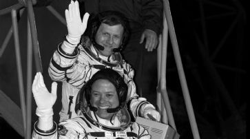 Andrej Borissenko und Ronald Garan winken zum Abschied vor dem Take-Off. /