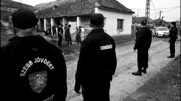 Festnahmen Unterdessen ging die Polizei gegen das Trainingslager vor und nahm 8 von 20 Teilnehmern wegen «Rowdytums» fest, wie Innenminister Sandor Pinter erklärte. Zur Rolle des Roten Kreuzes erläuterte Direktor Selymes, die Roma in Gyöngyöspata hätten sich am vergangenen Dienstag an das Rote Kreuz mit der Bitte gewandt, ein Ferienlager zu organisieren.Die selbsternannte Bürgerwehr in Ungarn. / Foto: indymedia.org
