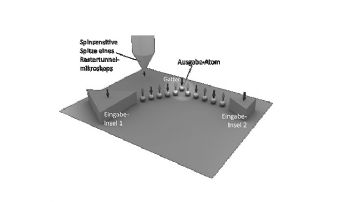 Nachfragen aus Japan und den USA «Es wird in dem System keine elektrische Ladung transportiert», sagt Roland Wiesendanger im Gespräch.Die Abbildung zeigt den Aufbau des kleinsten Nano-Spintronik-Logikgatters der Welt. /