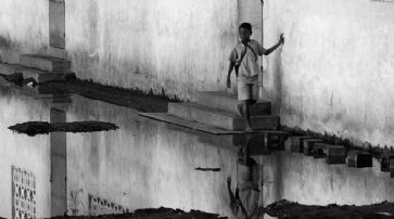 Ein Junge auf dem Nachhauseweg nach der Schule im überschwemmten Benin im Oktober 2010. /