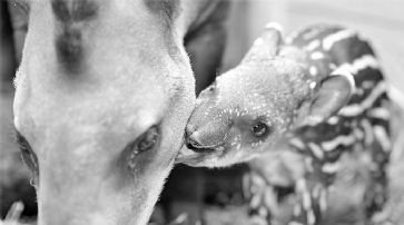 Ein kleiner, braunweiss gestreifter Kopf mit rüsselartiger Nase ragt aus dem Bassin. Tapirbub Lajas paddelt durchs Wasser, bis er wieder Grund unter den Hinterfüssen fühlt. Dann steigt er hinaus, glitzernd wirbeln die Tropfen. Hinter dem Kleinen schnauft behäbig Mama Amata an Land und macht sich sofort auf den Weg, um von den den nächsten Laubästen zu naschen. Lajas zottelt eifrig hinterher.