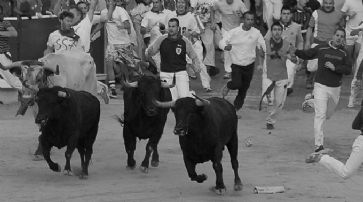 ![]() Hunderte wagemutige oder leichtsinnige Männer, die «Mozos», rennen auf der 825 Meter langen Strecke vor den Tieren her. Als einzige «Waffe», um die Bullen von sich fernzuhalten, ist eine zusammengerollte Zeitung erlaubt.