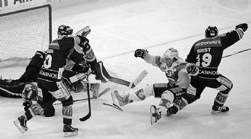 ![]() (17:12) Burkhalter (Riesen/Ausschluss Bodenmann) 1:1. 18. (17:35) Polak (Kellenberger, Jenni) 1:2. 30. Hartigan (Roest/Ausschluss Dupont) 2:2. 41. (40:56) Liniger (Stancescu) 2:3. 42. (41:52) Samuel Walser (Polak, Marti) 2:4. - Strafen: 6mal 2 plus 10 Minuten (Camenzind) gegen Rapperswil, 8mal 2 Minuten gegen Kloten. - PostFinance-Topskorer: Suri; Dupont. Rapperswil-Jona: Manzato; Geyer, Welti; Derrick Walser, Büsser; Maurer, Gmür; Bucher; Reid, Hartigan, Aurelio Lemm; Grauwiler, Roest, Suri; Riesen, Burkhalter, Nils Berger; Thibaudeau, Camenzind, Rizzello; Hürlimann. Kloten: Rüeger; Dupont, Blum; Schelling, Sven Berger; Westcott, Winkler; Marti; Wick, Santala, Bieber; Bodenmann, Liniger, Stancescu; Jenni, Kellenberger, Polak; Herren, Samuel Walser, Jacquemet. Bemerkungen: Rapperswil ohne Gailland, Murray, Siren (alle verletzt); Kloten ohne Steiner, Nordgren, Hollenstein, DuBois (alle verletzt) und Romano Lemm (krank). 48. Pfostenschuss Jenni.