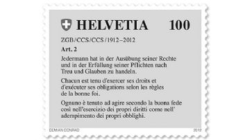 Hundert Jahre ZGB wird mit Sonderbriefmarke gefeiertBern - Das Schweizerische Zivilgesetzbuch (ZGB) ist am 1. Januar 2012 hundert Jahre alt geworden. Am Donnerstag wurde das Werk im Beisein von Justizministerin Simonetta Sommaruga und Post-Verwaltungsratspräsident Peter Hasler mit einem Festakt im Bundeshaus gewürdigt.knob / Quelle: sda / Donnerstag, 1. März 2012 / 15:38 h