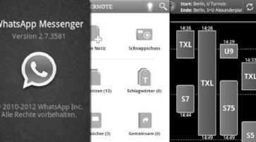 Kommunikation WhatsApp: Warum für Kurznachrichten zahlen, wenn man sowieso die ganze Zeit mit dem Smartphone online ist? - Diese Frage haben sich die Macher von WhatsApp gestellt und eine umfassende Messenger-Lösung präsentiert. Mit ihr kann man schnell und kostenlos Nachrichten, Fotos oder Videos an Freunde schicken - wenn diese die App auch installiert haben.Facebook, Twitter & Co.: Zum mobilen Posten in sozialen Netzwerken eignen sich natürlich die Original-Apps von Facebook,Google+ oder Twitter. Für Letzteres gibt es auch Alternativen, zum BeispielTweetCaster für Android oderTwitterrific für iOS.Entertainment Adobe Reader : Ohne PDFs geht es auch unterwegs nicht. Das Original-Anzeigeprogramm für das Format leistet gute Dienste beim Anzeigen oder Durchsuchen von Dokumenten. Verfügbar ist es sowohl für Android, als auch für die anderen beiden grossen mobilen Betriebssysteme iOS und Windows Phone.MX Video Player: Ein Videoplayer, der kein Format scheut, mehrere Prozessorkerne unterstützt und sich intuitiv bedienen lässt. Nur für Androiden.Shazam: Es ist eine Spielerei. Aber wem gerade partout ein Song nicht einfallen will, der ist für die App dankbar, die nach kurzem Hören innerhalb von Sekunden Song und Interpret ausgibt - oft sogar mit Songtexten oder Videos.TuneIn Radio: Internetradio ist unglaublich vielfältig. Die App TuneIn erleichtert mit tausenden katalogisierten Stationen und Sendungen die Auswahl.Navigation und Wetter Locus Free: Wer Karten ganzer Landstriche oder Länder auf Android-Handys offline verfügbar machen möchte, kann Locus Free nutzen. Mit der App lassen sich Kartendaten, hauptsächlich von Openstreetmap, uneingeschränkt im Smartphone-Speicher ablegen. Eine Alternative istMapDroyd .WhatsApp Messenger, Öffi und Evernote. / Foto: Teltarif