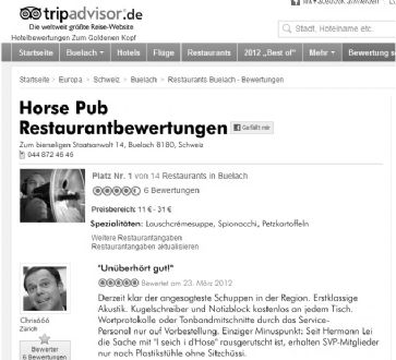 Top-Bewertung für Bülacher Horse PubDer für seinen Sanftmut und seine Feinsinnigkeit bekannte Nationalrat Christoph Mörgeli stellt dem Horse Pub in Bülach auf Tripadvisor ein erstklassiges Zeugnis aus.Quelle: Nebelspalter / Dienstag, 27. März 2012 / 19:45 h