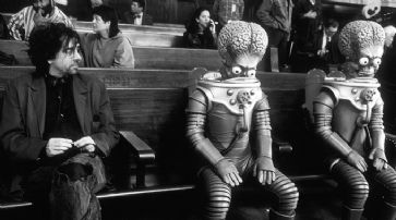 Neben den frühen Filmen «Pee-Wees irre Abenteuer» und «Lottergeist Beetlejuice» aus den Jahren 1987 und 1988, sind auch Burtons erste grosse Produktionen enthalten: Batman und Batmans Rückkehr von 1989 und 1992 mit Michael Keaton in der Titelrolle. In diesen Filmen konnte er seine Vorliebe für eine sehr spezielle düstere Stimmung voll ausleben, die Burton im Laufe der Zeit zu seinem persönlichen Stil ausgearbeitet hat. Tim Burton (l.): Mars Attacks! /