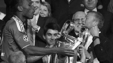Didier Drogba überreicht seinem Chef, Roman Abramowitsch, den Pokal. /