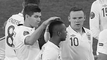 Steven Gerrard und Wayne Rooney trösten Ashley Cole nach seinem verschossenen Elfmeter. /