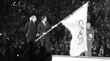 Jaques Rogge bei der Übergabe der Olympischen Flagge an Eduardo Paes. /