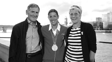 Spirig zeigte sich überwältigt: «Das Adrenalin ist so hoch, dass ich keine Müdigkeit spüre», sagte die 30-jährige Zürcher Unterländerin auf der Bühne gegenüber Speakerin Regula Späni. Dabei war Spirig als Schweizer Fahnenträgerin der Schlussfeier vor ihrem Heimflug kaum zu Schlaf gekommen. Mädchenriege begeisterte Spirig und Zuschauer Mitten ins Herz wurde Nicola Spirig von einer Vorführung der Mädchenriege von Winkel getroffen. Vor allem «die Liebe zum Detail» entzückte Spirig. Mit «Ironkids»-Badkappen sowie der (London-)Nummer 43 auf dem Arm, auf Dreirädern und mit Sonnenbrillen imitierten die Mädchen den olympischen Triathlon samt Zieleinlauf. Spirig: «Diesen haben sie fast besser gemacht als ich selbst. Ich war fast zu Tränen gerührt.» Weil die Vorführung auch bei den Zuschauern auf ein begeisterndes Echo stiess, erfolgte später gar noch eine entsprechende «Triathlon-Zugabe.» Die Mädchen im Alter von vier bis 13 Jahren hatten sich eine Woche vorbereitet, beginnend also fast unmittelbar nach dem Olympiasieg von Spirig. Schliesslich überreichten sie Nicola Spirig noch ein Geschenk. Nicola Spirig mit ihren Eltern Sepp und Ursula. (Archivbild) /