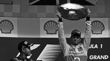 Jenson Button auf dem Podest mit zweitplatziertem Sebastian Vettel. / Foto: EQ Images