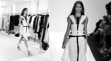 Die Models trugen weisse, wadenlange Kleider mit Chiffon-Röcken und verschiedenen schwarzen Detailverzierungen. Ein Kleider-Highlight der Kollektion wurde von einem dunklen Gürtel in der Taille zusammen gehalten und eine vertikale Linie, die in der Mitte des Kleides nach unten lief, setzte einen Akzent. Ausserdem zu sehen waren ein schwarzes Top im Zickzack-Design sowie schwarze Spitzenshorts in Kombination mit einem weissen Top und ledernem V-Ausschnitt.