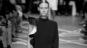 Beim ersten Look in leuchtendem Hellblau handelte es sich um ein schlichtes, knielanges Kleid, das mit nur einem langen Ärmel ausgestattet war. Im Brustbereich dominierte ein überdimensionaler Rüschenkragen in Halbmondform. Dieser Look eignete sich perfekt zur Eröffnung der Schau und machte den Weg frei für die weitere Kollektion. Ein Outfit zeigte schwarze, lange Hosen, die mit einem Tunika-Kleid kombiniert wurden. Auch dieses verfügte über nur einen Ärmel, während die andere Seite von der Schulter bis zur Taille komplett aus grossen Rüschen bestand. Hosenanzüge in Schwarz und Weiss, meist mit schlichter Zigarrettenform im Beinbereich und übergrossen Jacketts waren ein grosses Thema. Später mischte der Designer eine Spur taupe in die Kreationen und fügte schlichten Hosen lange, edle Westen hinzu, die äusserst elegant wirkten.