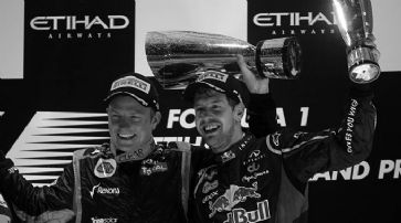 Sergio Perez beraubte sich seiner Chancen auf ein zählbares Ergebnis mit einer unüberlegten Aktion ein weiteres Mal selber. Der Mexikaner war im Kampf um Platz 6 mit Romain Grosjean ins Gehege gekommen und musste dafür als Schuldiger seine Fahrt mit einem zehn Sekunden dauernden Zwischenhalt in der Box unterbrechen und fiel dadurch zurück. Am 30. August 2009 wars gewesen, als Räikkönen letztmals nach einem Grand Prix ganz oben gestanden hatte. Als Ferrari-Fahrer hatte der Finne in Belgien triumphiert. Insgesamt feierte Räikkönen seinen 19. Sieg in der Formel 1, den ersten seit seinem Comeback auf diese Saison hin. Der frühere Sauber-Fahrer profitierte dabei auch vom Pech von Lewis Hamilton. Für den Engländer kam das Aus in der 20. der 55 Runden. Hamilton , der das Wochenende zuvor fast nach Belieben dominiert und auch das Rennen souverän angeführt hatte, musste den McLaren ausrollen lassen. Fernando Alonso wurde Zweiter, vermochte seinen Rückstand auf Sebastian Vettel in der WM-Gesamtwertung aber nicht in erhofftem Masse zu reduzieren. Der Deutsche belegte trotz des Handicaps, aus der Boxengasse gestartet zu sein, vor Jenson Button Platz 3, womit sich seine Marge auf Alonso nur um 3 auf 10 Punkte reduzierte. Vettel war nach dem Qualifying, von den Stewards wegen zu geringer Benzinmenge auf den letzten Startplatz zurückversetzt worden. Der Weltmeister hatte sich nach wenigen Runden bis auf Platz 12 vorgekämpft und danach von einer ersten Safety-Car-Phase profitiert, in der das gesamte Feld wieder zusammengerückt war. Eine Kollision zwischen Nico Rosberg im Mercedes und Karain Karthikeyan im HRT hatte für die Neutralisation des Rennens gesorgt. Nach der Wiederfreigabe war aber Vettel zu einem ersten, ausserplanmässigen Zwischenhalt gezwungen, um sich nach einer Berührung mit dem Williams mit Bruno Senna einen neuen Frontflügel abzuholen. Die Aufholjagd begann von Neuem. Und diesmal liess sich Vettel auf dem Weg zu Rang 3 durch nichts mehr aufhalten. Abu Dhabi. Grand Prix der Vereinigten Arabischen Emirate: 1. Kimi Räikkönen (Fi), Lotus-Renault. 2. Fernando Alonso (Sp), Ferrari, 0,8 Sekunden zurück. 3. Sebastian Vettel (De), Red Bull-Renault, 4,1. 4. Jenson Button (Gb), McLaren-Mercedes, 7,7. 5. Pastor Maldonado (Ven), Williams-Renault, 13,0. 6. Kamui Kobayashi (Jap), Sauber-Ferrari, 20,0. 7. Felipe Massa (Br), Ferrari, 22,8. 8. Bruno Senna (Br), Williams-Renault, 23,5. 9. Paul di Resta (Gb), Force India-Mercedes, 24,1. 10. Daniel Ricciardo (Au), Toro Rosso-Ferrari, 27,4. 11. Michael Schumacher (De), Mercedes, 26,0. Kimi Räikkönen und Sebastian Vettel auf dem Podest. /