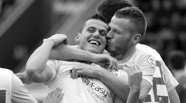 Thun Arena. - 5932 Zuschauer. - SR Jaccottet. - Tore: 15. Teixeira (Freistoss Chiumiento) 0:1. 28. Jahovic (Chiumiento) 0:2. 46. Kukuruzovic 0:3. Doppel-Torschütze Stjepan Kukuruzovic wird von MItspieler Stefan Glarner geherzt. /