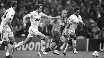 Cluj darf noch hoffen Ebenfalls noch Chancen auf einen Platz in den Achtelfinals hat CRF Cluj, das sich dank dem 3:1 gegen Sporting Braga zumindest Platz 3 und damit den Einzug in die Europa League gesichert hat. Der Stürmer Rui Pedro, einer von fünf portugiesischen Spielern in der Startaufstellung der Rumänen, war der Mann des Abends. Der 24-Jährige sorgte in den ersten 33 Minuten mit seinen drei Toren früh für die Vorentscheidung. Der rumänische Meister, der in den Playoffs den FC Basel ausgeschaltet hatte, könnte sich erstmals für die K.o.-Phase der Königsklasse qualifizieren. Galatasaray Istanbul - Manchester United 1:0 (0:0)Ali Sami Yen. - 40'000 Zuschauer. - SR Velasco Carballo (Sp). - Tor: 53. Burak Yilmaz 1:0. - Bemerkung: ManU ohne Evans, Kagawa, Nani, Vidic (alle verletzt), De Gea, Evra, Ferdinand, Giggs, Rooney, Scholes und Van Persie (alle geschont). CFR Cluj - Sporting Braga 3:1 (3:1) Constantin Radulescu. - 15'000 Zuschauer. - Karasew (Russ). - Tore: 7. Rui Pedro 1:0. Galatasarays Nordin Amrabat setzt sich gegen drei Spieler von Manchester durch. / Foto: EQ Images