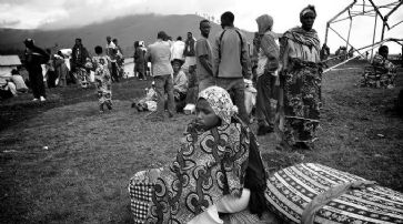 Flüchtlinge aus Kongo, die in einem ruandischen Durchgangslager auf etwas Nahrung warten. /
