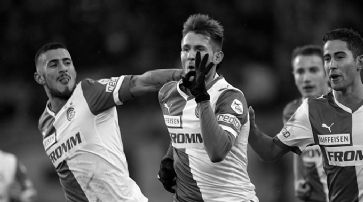 Letzigrund. - 18'400 Zuschauer. - SR Graf. Frank Feltscher und Nassim Ben Khalifa jubeln mit dem Torschützen zum 1:0 Izet Hajrovic. /