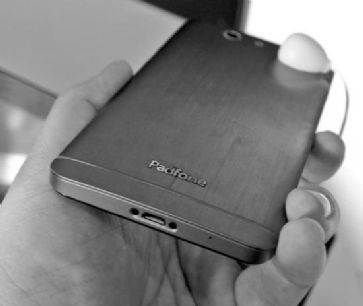 ![]() Das Gehäuse des Padfone besteht aus Aluminium. Auf der Rückseite befindet sich eine 13 Megapixel-Kamera, an der unteren Kante der Micro-USB-Anschluss. /