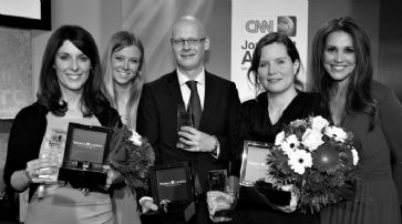 CNN Journalists of the Year & Gewinner der Kategorie TV «Der Beitrag 'Acht Türken, ein Grieche und eine Polizistin' hat durch seine intensive Rechercheleistung sehr beeindruckt», so Juryvorsitzender Franz Fischlin (Journalist und Moderator der Tagesschau auf SRF). Die Jury bewertete die Dokumentation als Beispiel für zeitintensiven, gut recherchierten und investigativen Journalismus. «Die Journalisten erwiesen die Ausdauer, an einem brisanten Thema dran zu bleiben und es in einem neuen Blickwinkel in den Fokus der Öffentlichkeit zu rücken», heisst es in der Begründung der Jury.Die Preisträger der anderen Kategorien sind: Radio: Sabine Rossi («Anruf aus Damaskus», WDR Funkhaus Europa) Die Journalistin stand von Februar bis August 2012 in engem Kontakt mit einem jungen Familienvater in Damaskus. In 46 Anrufen berichtete er von der Lage in der syrischen Hauptstadt. «Sabine Rossi hat es geschafft, durch regelmässige Anrufe nach Syrien, einem Land, in das kaum mehr Journalisten einreisen können, den Hörern einen direkten Einblick in das Leben und das Schicksal einer Familie zu gewähren», heisst es in der Begründung der Jury. Print: Takis Würger («Das verlorene Bataillon», DER SPIEGEL) Würger begleitete in seinem Beitrag eine Einheit deutscher Scharfschützen in Afghanistan. Einer der Soldaten ist Christian Sommerkorn. Er wartet darauf, zum ersten Mal einen Menschen zu töten und weiss nicht, ob er sich darauf freuen oder davor fürchten soll.v.l.n.r. Anne-Kathrin Thüringer, Nina Eichinger, Matthias Deiss, Eva Müller, Karen Webb. /