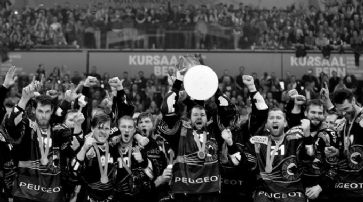 So sieht der Pokal von unten aus: Die Berner jubeln über den Titel. / Foto: EQ Images