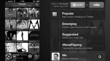 ![]() Dazu werden «versteckte Talente» angezeigt und zur Wiedergabe angeboten, die Twitter in den Tweets seiner Nutzer gefunden hat. Nicht zuletzt gibt es bei Twitter Music auch Empfehlungen für Musiktitel, von denen Twitter denkt, dass sie den Geschmack des Nutzers treffen. Musiktitel können direkt bei iTunes gekauft werden Alle Songs werden standardmässig nur kurz angespielt. Zudem wird jeweils ein iTunes-Button angezeigt. Darüber können die gehörten Musikstücke oder das Album, auf dem der Titel zu hören ist, direkt am Smartphone, Tablet oder Multimedia-Player gekauft werden. Wer die Musik-Flatrates von Spotify und Rdio nutzt, kann seinen jeweiligen Account mit Twitter Music verbinden. So lassen sich die Songs auch komplett anhören. Technisch funktioniert Twitter Music einwandfrei. Die Musikwiedergabe funktioniert sowohl über WLAN, als auch im Mobilfunknetz. Die Benutzeroberfläche ist recht ansprechend gestaltet und die Bedienung klappt intuitiv. Abzuwarten bleibt, wann der Dienst auch für deutsche Interessenten offiziell verfügbar ist und wann die Anwendung für weitere Smartphone-Plattformen bereitgestellt wird.