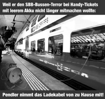 Bussen-Ärger: Soweit ist es schon gekommenAuch wenn die SBB ab 1. Juni nur noch 30 statt 90 Franken einkassieren wollen: Für Ärger mit den elektronischen Tickets ist weiterhin gesorgt.Quelle: Nebelspalter / Dienstag, 7. Mai 2013 / 19:52 h