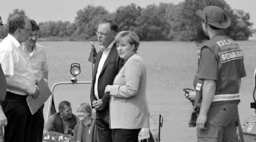 Merkel begutachtet die kritische Lage an der Elbe selber. /