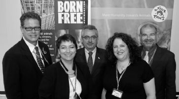 Zoo-Bericht mit erschreckenden Ergebnissen Die Born Free Tierschutzstiftung stellte ihren europaweiten Zoo-Bericht vor mit teilweise erschreckenden Ergebnissen: Weit über die Hälfte der Zoologischen Einrichtungen in den besuchten Ländern entsprechen nicht annährend den ohnehin sehr vagen Vorgaben der EU-Zoorichtlinie. Wildtiere werden bisher in der EU kaum beachtet - dies zu ändern fordert seit Jahren nicht nur die allgemeine Öffentlichkeit. Auch die in der Konferenz versammelten Experten stellten unmissverständlich klar, dass eine europaweite Harmonisierung von Haltungsbedingungen nicht nur landwirtschaftliche Nutztiere betrifft, sondern auch die Wildtierhaltung ein zu schliessen hat. «Diese sind für ein gemeinsames europaweites Verständnis der Mensch-Tier-Beziehung unabdingbar», sagte Marlene Wartenberg, Leiterin des Europabüros von «Vier Pfoten» in Brüssel.(v.l.n.r.) Will Travers (CEO Born Free), Marlene Wartenberg («Vier Pfoten»), Christophe Buhot (FVE), Joanna Swabe (HSI), Heli Dungler («Vier Pfoten»). /