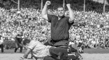 Stucki und Sempach überzeugen Im vierten Gang ebenfalls seine erste Niederlage bezog Koch. Er verlor in den letzten Sekunden des Durchgangs gegen Stucki, der damit einen Gestellten gerade noch so verhindern konnte. Zusammen mit Sempach hinterliess Stucki am ersten Tag den klar besten Eindruck der Spitzenschwinger. In den ersten 6 Rängen (19 Schwinger) sind nicht weniger als zehn Berner klassiert. Die Einheimischen dominieren «ihr» Fest bisher eindrücklich - sehr zur Freude der vielen Berner im Stadion. Die Emmental Arena war selbstredend mit 52'013 Zuschauern bis auf den letzten Platz besetzt.Rangliste: (Stand nach vier Gängen)1. Christian Stucki (Lyss) und Bernhard Kämpf (Sigriswil) je 39,75. 2. Matthias Sempach (Alchenstorf) 39,50. 3. Raphael Zwyssig (Gais) 39,00. 4. Christian Stucki jubelt nach seinem Sieg gegen Marcel Mathis.