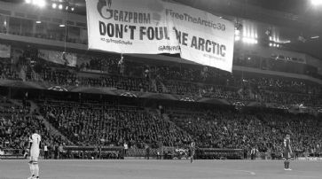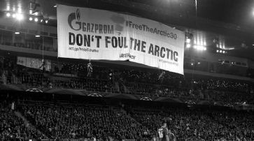 Vier Mitglieder der Umweltschutzorganisation seilten sich vom Stadiondach des «St.-Jakob-Parks» ab und breiteten ein riesiges gelbes Transparent aus: «GAZPROM DON'T FOUL THE ARCTIC».
