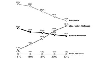 Schwindende Mitgliederzahlen aber beständig höhere Pauschalen? Hardliner wollen allerdings selbst diesen kleinen Schritt bodigen, sie sprechen in ihrer Gegenkampagne von «Raubbau». Wie abenteuerlich diese Argumentation ist, zeigt die Entwicklung der Kirchenverbundenheit in der Bevölkerung: 1970 gehörten 94% der Schaffhauser Bevölkerung einer Landeskirche an, 2012 waren es noch 63%. Das ist im interkantonalen Vergleich zwar noch viel, doch der gesamtschweizerische Trend macht auch vor Schaffhausen nicht halt: die reformierte Kirche befindet sich im Sinkflug, die römisch-katholische Kirche schrumpft dank der Zuwanderung von Katholiken etwas langsamer, aber ebenfalls beständig.Obwohl sie stetig an Mitgliedern verlieren, wollen Sie ihre Privilegien behalten: Entwicklung der Bekenntnisszahlen in Schaffhausen seit 1970. /