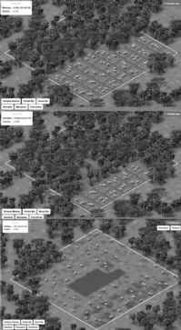![]() Ausmass der Abholzung bei verschiedenen Zahlungstypen: Zahlung pro Hektare (oben), CO2-Berechnung (Mitte), keine Zahlung (unten). /