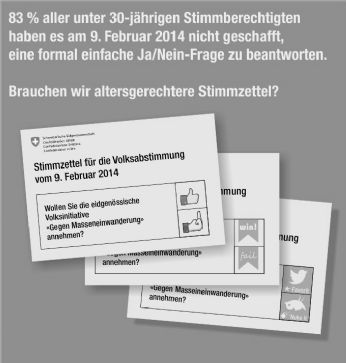 Stimmfaule Jugend: Bund prüft Massnahmen83 Prozent der Stimmberechtigten unter 30 Jahren waren am 9. Februar 2014 offensichtlich nicht in der Lage, eine formal einfache Ja/Nein-Frage zu beantworten.Quelle: Nebelspalter / Freitag, 4. April 2014 / 16:02 h