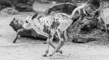 Das Zwergzebu-Kälbchen ist auf der Aussenanlage zur Welt gekommen. In den ersten Tagen war es recht zurückhaltend, auch auf dem Weg vom Stall ins Aussengehe versteckte es sich jeweils hinter seiner Mutter. Nach und nach wurde es immer übermütiger. Neugierig näherte es sich den anderen Zwergzebu-Kühen und suchte nach den Zitzen. Sogar beim Stier schaute es nach, ob vielleicht bei ihm etwas zu holen wäre.
