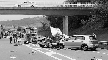 Der Fahrer war auf der Stelle tot. Seine Ehefrau auf dem Beifahrersitz zog sich nur leichte Verletzungen zu und wurde psychologisch betreut.