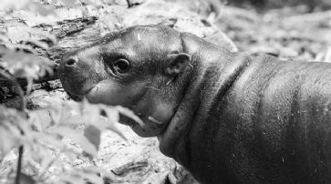 Das kleine Zwergflusspferd schnuppert am Tümpel und am Futter der Mutter. Ganz so interessiert am Grashaufen wie Ashaki ist Lani aber noch nicht. Sie beginnt erst gerade, festes Futter zu fressen.