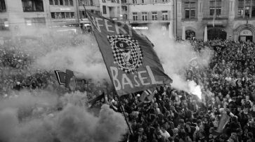 Der Höhepunkt Zur offiziellen Feier zogen anschliessend weit über zehntausend Fans singend Fahnen schwenkend und Pyros zündend auf den Barfüsserplatz. Dort warteten sie auf den Höhepunkt des Abends, den Auftritt der Mannschaft, die mit Trikes anfuhr.Die Fans feiern auf dem Barfüsserplatz ihren FCB. /