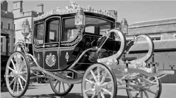 ![]() Gezogen wird die Kutsche von sechs Pferden. Die fünfeinhalb Meter lange und mehr als drei Tonnen schwere Kutsche wurde aus Teilen der Kriegsschiffe des berüchtigten Königs Henry VIII. und Admiral Nelson sowie Holz aus dem vermeintlichen Apfelbaum des Naturforschers Isaac Newton gebaut. Heute nutzte die Queen erstmals die Kutsche für eine Ausfahrt.