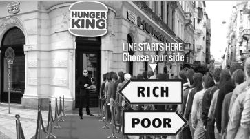 Vor dem vermeintlichen Fast Food-Restaurant «Hunger King» in Budapest gibt es zwei Warteschlangen. Die Armen müssen Schlange stehen, während die Reichen auf dem Roten Teppich arrogant an ihnen vorbei ziehen können. Doch das hat seinen Preis. Für umgerechnet 2370 Franken bekommen die Reichen drinnen einen Hunger Burger oder eine Kapitalisten-Cola.