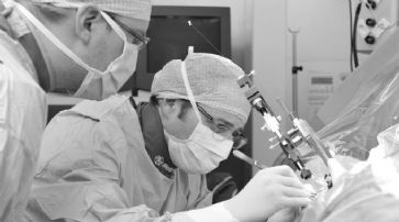 DBS kommt für jene Patienten in Frage, die nicht auf Parkinson-Medikamente ansprechen. Die Methode hat jedoch eine unangenehme Nebenwirkung: Oft stimuliert sie zu grosse Hirnregionen und löst dadurch Muskelkrämpfe aus. Nun haben Forschende des Inselspitals und der EPFL eine wenige Quadratmillimeter kleine Mini-Elektrode mit drei selektiv einschaltbaren Stromkontakten entwickelt, die Muskelkrämpfe verhindert. Claudio Pollo setzt einem Patienten eine DBS-Minisonde ein. /