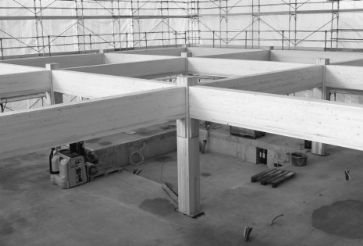 Die vorgespannte Rahmenkonstruktion im HoNR besteht aus Stützen aus Esche und Trägern aus Esche und Fichte. / Foto: Andrea Frangi / ETH Zürich