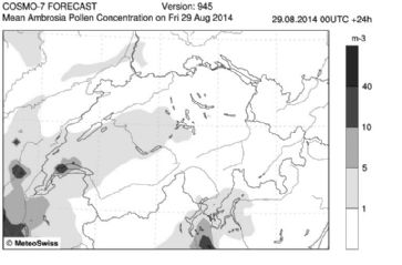 Neue flächendeckende Prognosen für AmbrosiapollenBern - In der Schweiz gibt es erstmals flächendeckende Prognosen für Ambrosiapollen. In Kartenform wird dargestellt, wann wie viele Pollen in der Luft erwartet werden, wie MeteoSchweiz mitteilte.awe / Quelle: sda / Freitag, 29. August 2014 / 12:48 h