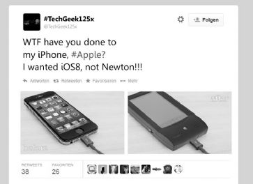 Bereits wenige Minuten nachdem der vermeintliche Download-Link zum neuen Betriebssystems iOS 8 verfügbar war, tauchten auf Twitter erste Horrormeldungen auf: Zahlreiche Smartphone-Besitzer hatten offensichtlich nicht ein neues Betriebssystem, sondern eine vorerst unbekannte Hardware heruntergeladen und installiert. Bilder, die inzwischen auf Social-Media-Netzwerken zirkulieren, lassen vermuten, dass es sich um ein umfangreiches Downgrade auf Apples «Newton» handelt, ein reichlich erfolgloses Produkt mit Flüssigkristallbildschirm, das die Firma von 1993 bis 1998 hergestellt und vertrieben hatte.