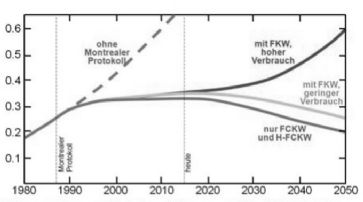 ![]() Heizleistung von fluor- und chlorhaltigen Kohlenwasserstoffen (FCKW) bis 2050. Blaue Kurve: nur FCKW und chlorhaltige Ersatzstoffe (H-FCKW). Orange und Rot: Heizleistung inklusive der chlorfreien Fluorkohlenwasserstoffe (FKW). /