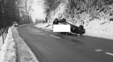 Auf dem Dach liegend kam der PW zum Stillstand, nachdem zuvor ein Überholmanöver schief gegangen war. /