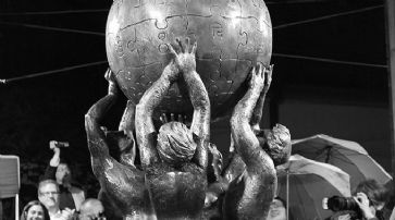Merkmal aus Kunststoff Das vom armenischen Bildhauer Mihran Hakobyan geschaffene Denkmal zeigt zwei Frauen und zwei Männer, die eine Weltkugel aus Puzzleteilen über ihre Köpfe heben. Es steht auf einem Sockel und sieht aus, als wäre es aus Bronze. Hergestellt wurde es allerdings aus einem wetterbeständigen Kunststoff. Das vom armenischen Bildhauer Mihran Hakobyan geschaffene Denkmal zeigt zwei Frauen und zwei Männer, die eine Weltkugel aus Puzzleteilen über ihre Köpfe heben. / Foto: Wikipedia / Awersowy Lizenz: CC BY-SA-3.0