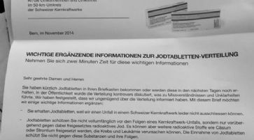 Gefälschter Brief zu Jodtabletten in vielen Schweizer BriefkästenBern - Viele Schweizer Haushalte haben am Donnerstag einen Brief mit Informationen zur Jodtabletten-Verteilung erhalten. Dieser ist jedoch gefälscht: Er stammt nicht wie angegeben von der für die Verteilung zuständigen Geschäftsstelle, sondern von Umweltaktivisten.flok / Quelle: sda / Donnerstag, 13. November 2014 / 15:52 h