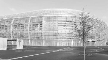 Möglich macht dies ein schliessbares Dach. Versteckt hinter einem schwarzen Vorhang liegen nun die beiden Hälften des Platzes übereinander, der Naturrasen wurde zusammengerollt und verstaut. Das Stade Pierre Mauroy. /
